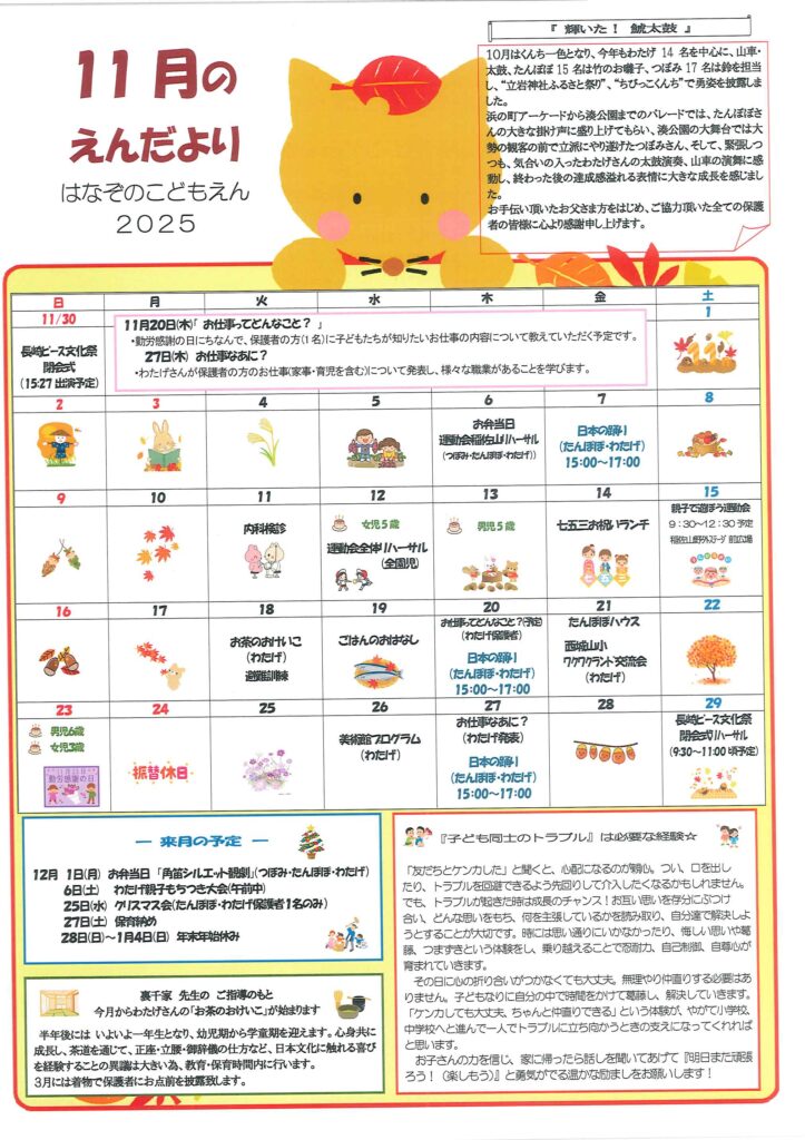 ![]() | ●内科検診 ●秋季水泳教室(わたげ) ●勤労会社の日にちなんで ~お仕事なあに? ・お店屋さん体験~ | ●平和学習(原爆資料館見学・ 山王神社・くすの木のお見舞い) ●親子で遊ぼう運動大会 ●お茶のおけいこ始め ●七五三のお祝い |