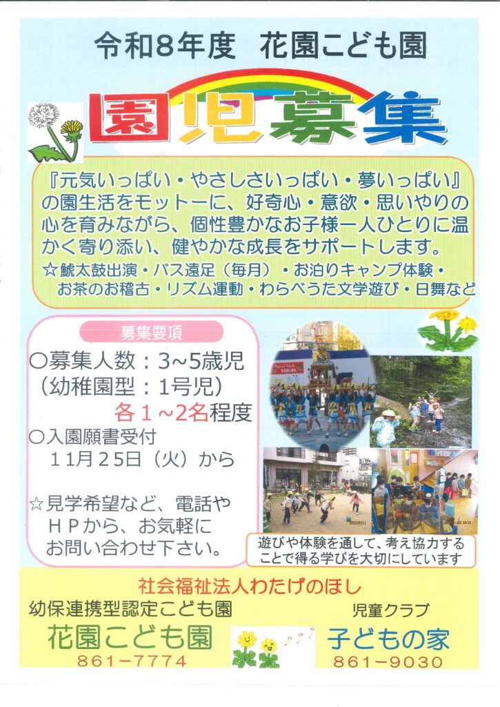 ![]() | ●立岩神社ふるさと祭り (わたげ・たんぽぽ) ●ちびっこくんち (わたげ・たんぽぽ・つぼみ) | ●バイオパーク遠足 ●花の苗植え |