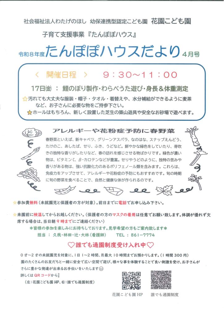 令和8年度 4月 子育て支援教室『たんぽぽハウスだより』 2026 4/01 おたより お知らせ 2026年4月1日 おたより お知らせ よかったらシェアしてね! URLをコピーしました! URLをコピーしました! 令和8年度 園だより・給食だより 関連記事 令和8年度 園だより・給食だより 2026年4月1日 3月 子育て支援教室『たんぽぽハウスだより』 2026年2月27日 3月 園だより・給食だより 2026年2月27日 2月 子育て支援教室『たんぽぽハウスだより』 2026年1月30日 2月 園だより・給食だより・学童だより 2026年1月30日 重要事項説明書(令和7年度4月作成) 2026年1月6日 1月 たんぽぽハウスだより 2026年1月1日 1月 園だより・給食だより 2026年1月1日